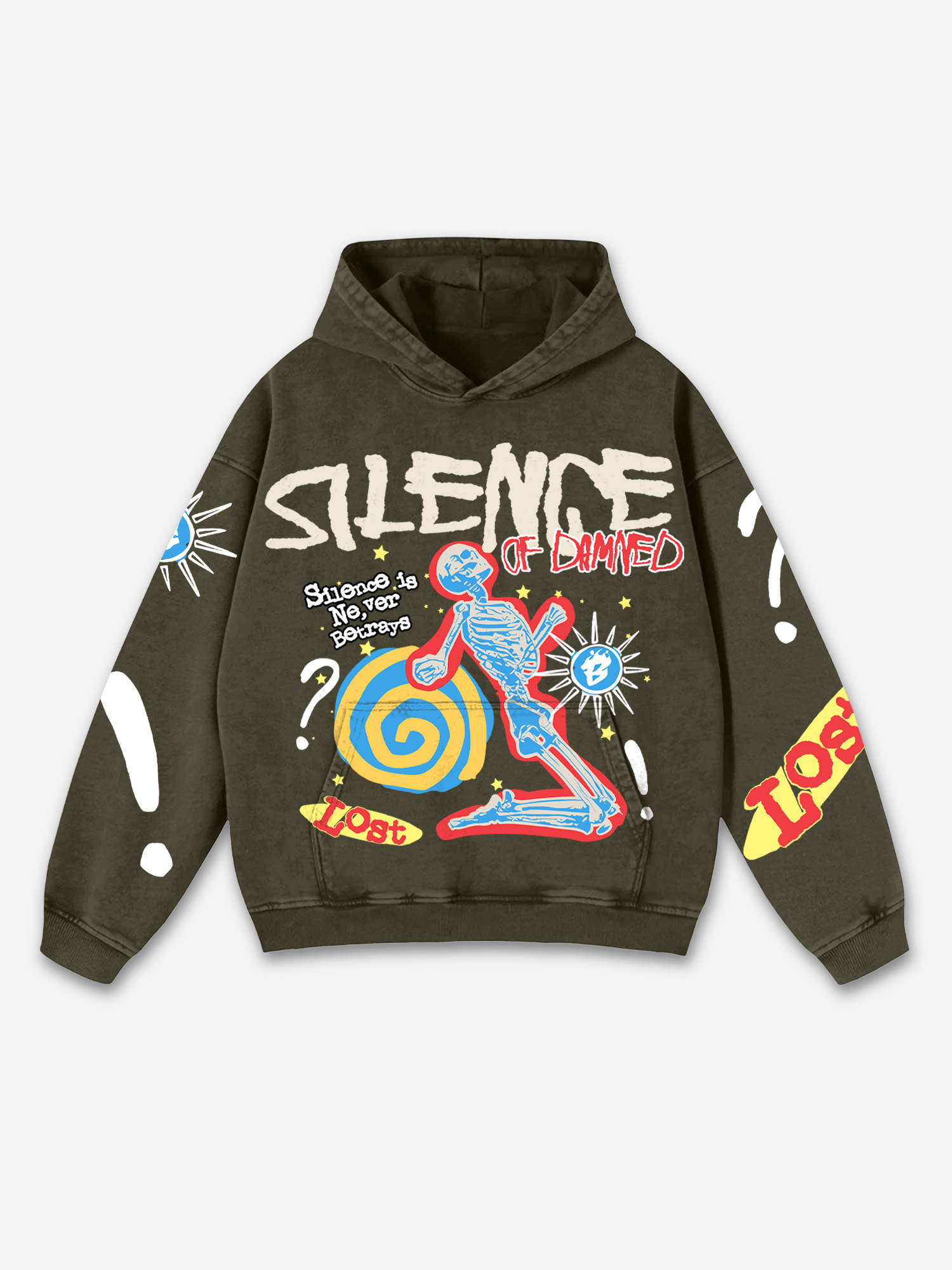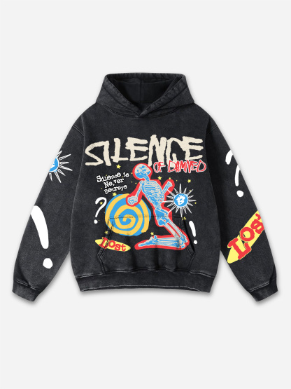 Retro Silence Of Damned Skull Oversized Graphic Acid Wash Hoodie