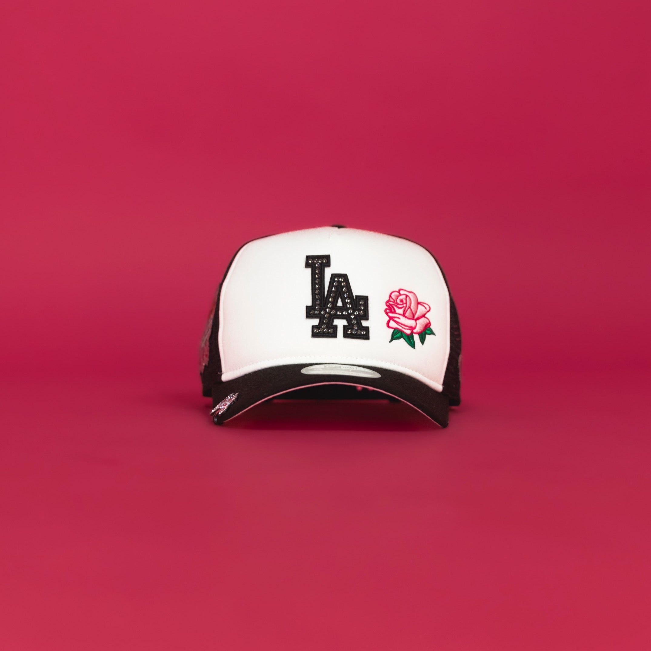 NEW ERA EXCLUSIVE 9FIFTY A-FRAME WHITE/BLACK LOS ANGELES DODGERS + PINK ROSE MESHBACK W/ 100TH ANNIVERSARY SIDE PATCH
