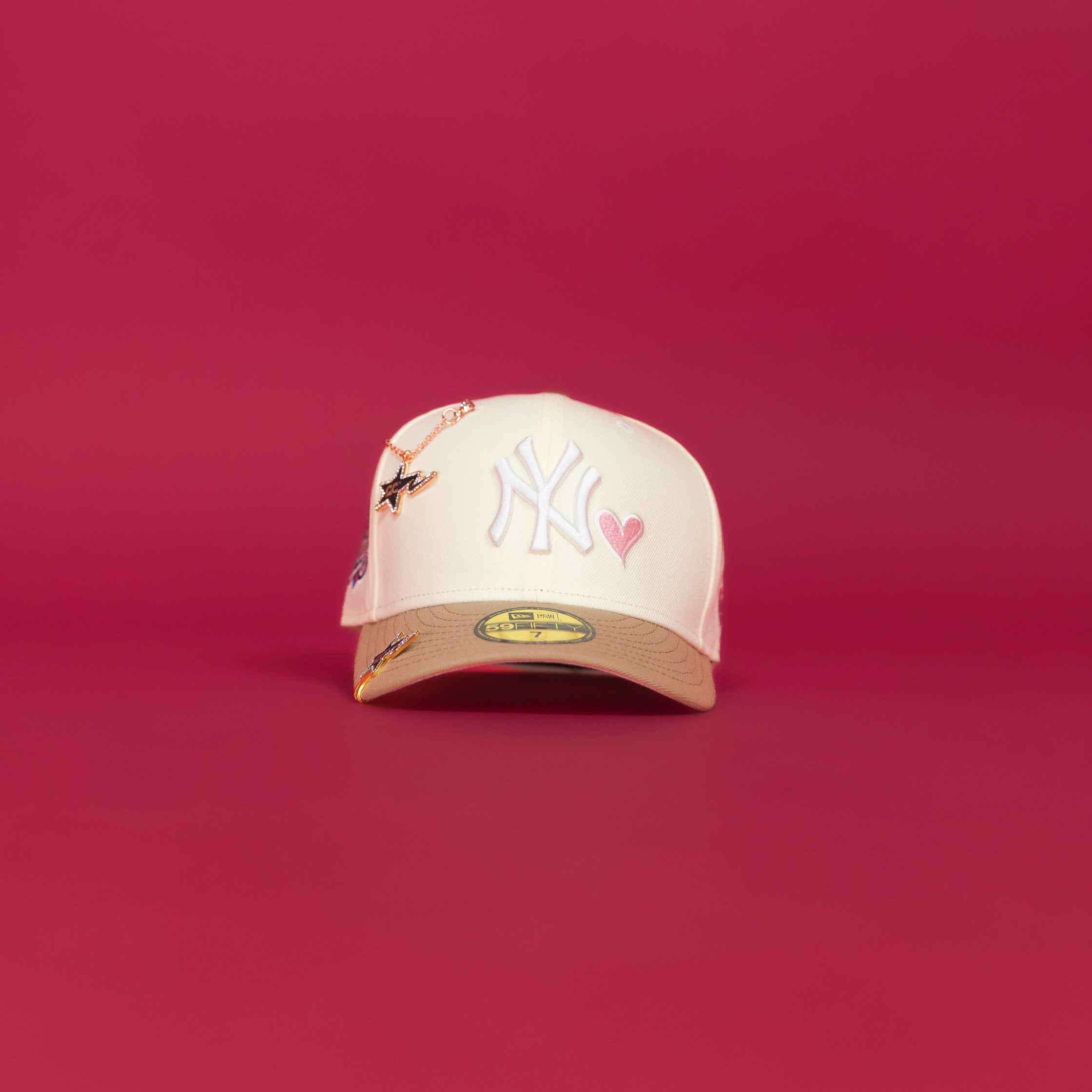 NEW ERA EXCLUSIVE 59FIFTY CHROME/ LIGHT KHAKI NEW YORK YANKEES W/ PINK HEART + 1999 WORLD SERIES SIDE PATCH